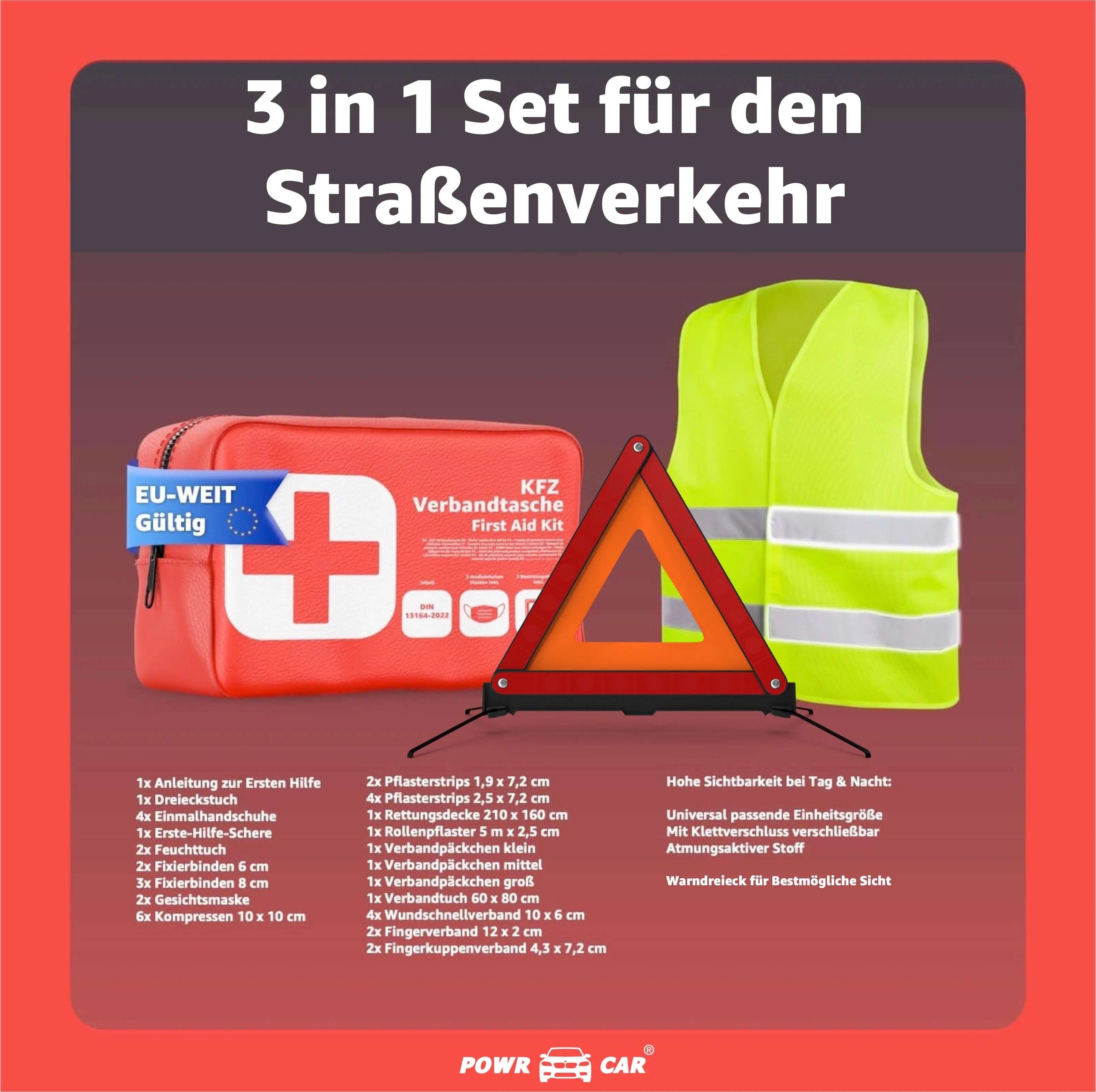 3 in 1 Set Auto Erste Hilfe Kit 2026 - KFZ-Verbandskasten, Warnweste & Pannenset