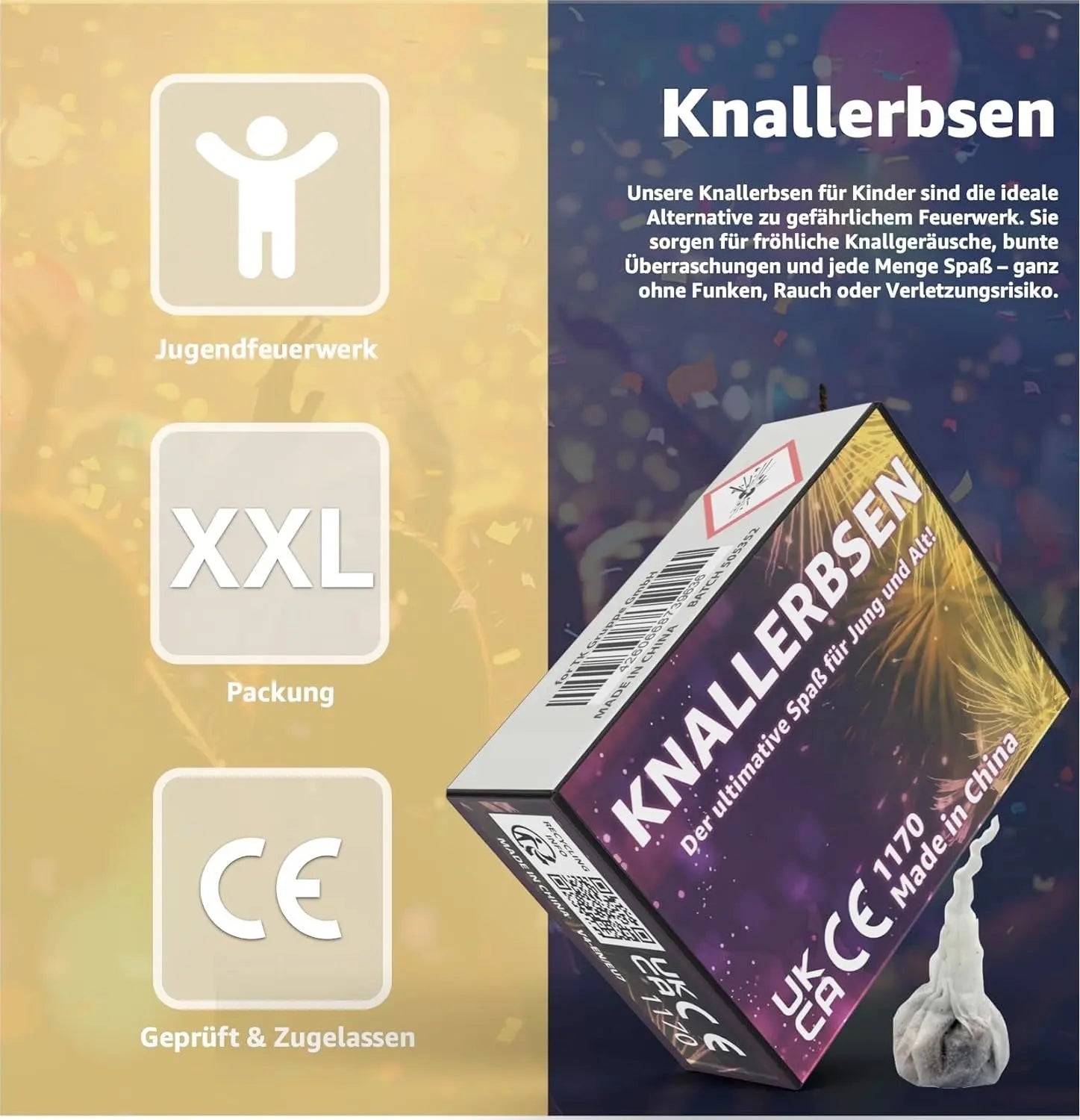 Erleben Sie den unvergesslichen Klang und das aufregende Erlebnis mit unserem Knallerbsen-Set, das den perfekten Auftakt für das neue Jahr bietet oder jede Feier belebt. Diese Feuerwerkskörper sind bemerkenswert einfach in der Handhabung: Keine spezielle Ausrüstung erforderlich, einfach auf den Boden werfen und den spektakulären Effekt genießen. Ideal für Nutzer ab 12 Jahren, bietet es unterhaltsamen Spaß für die ganze Familie.