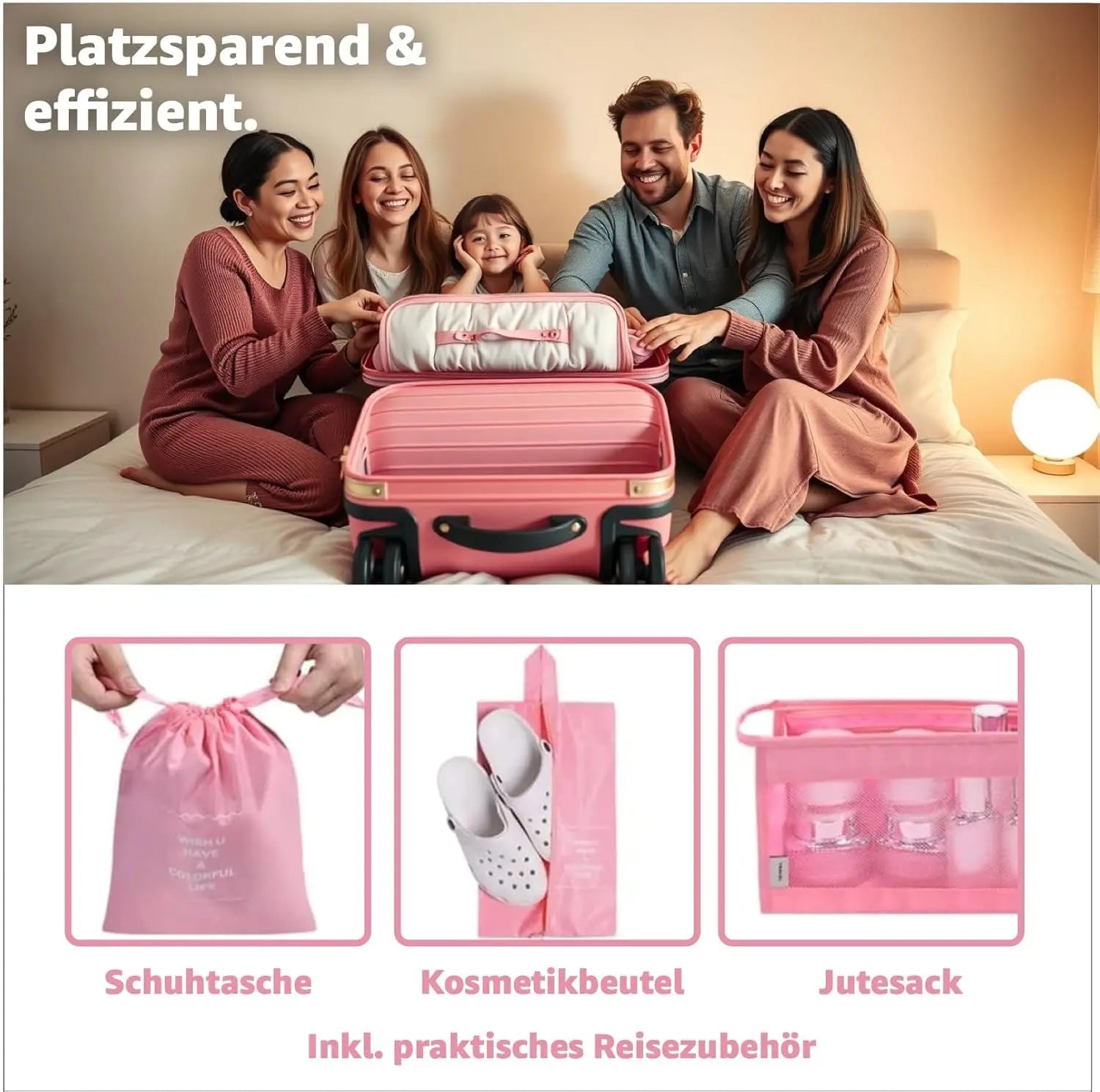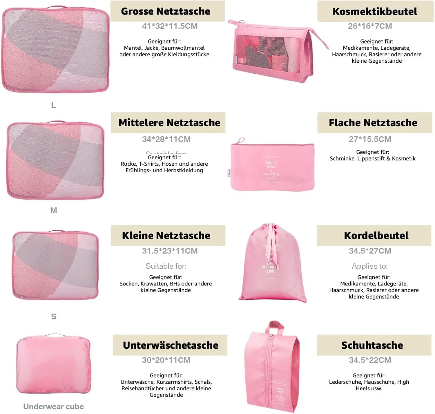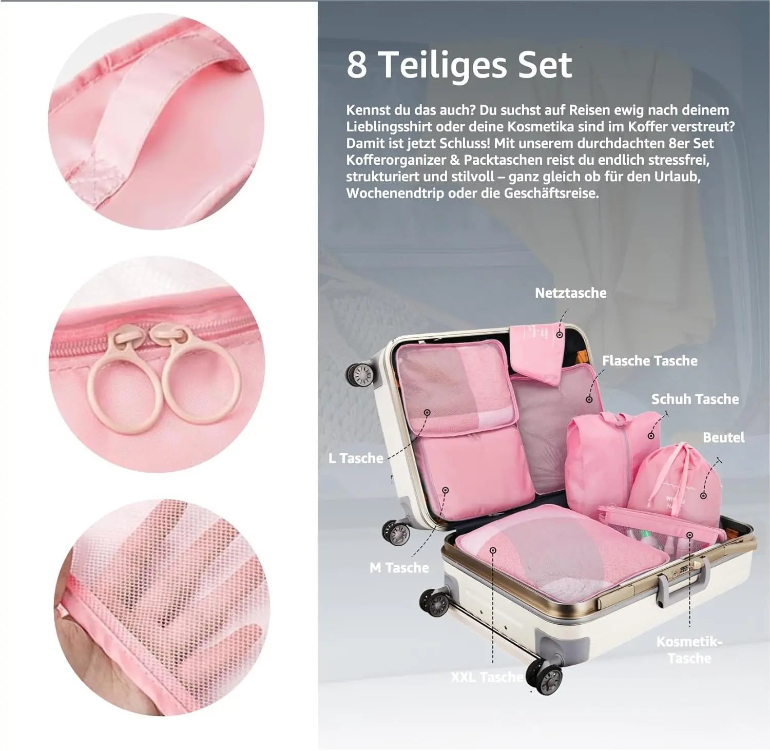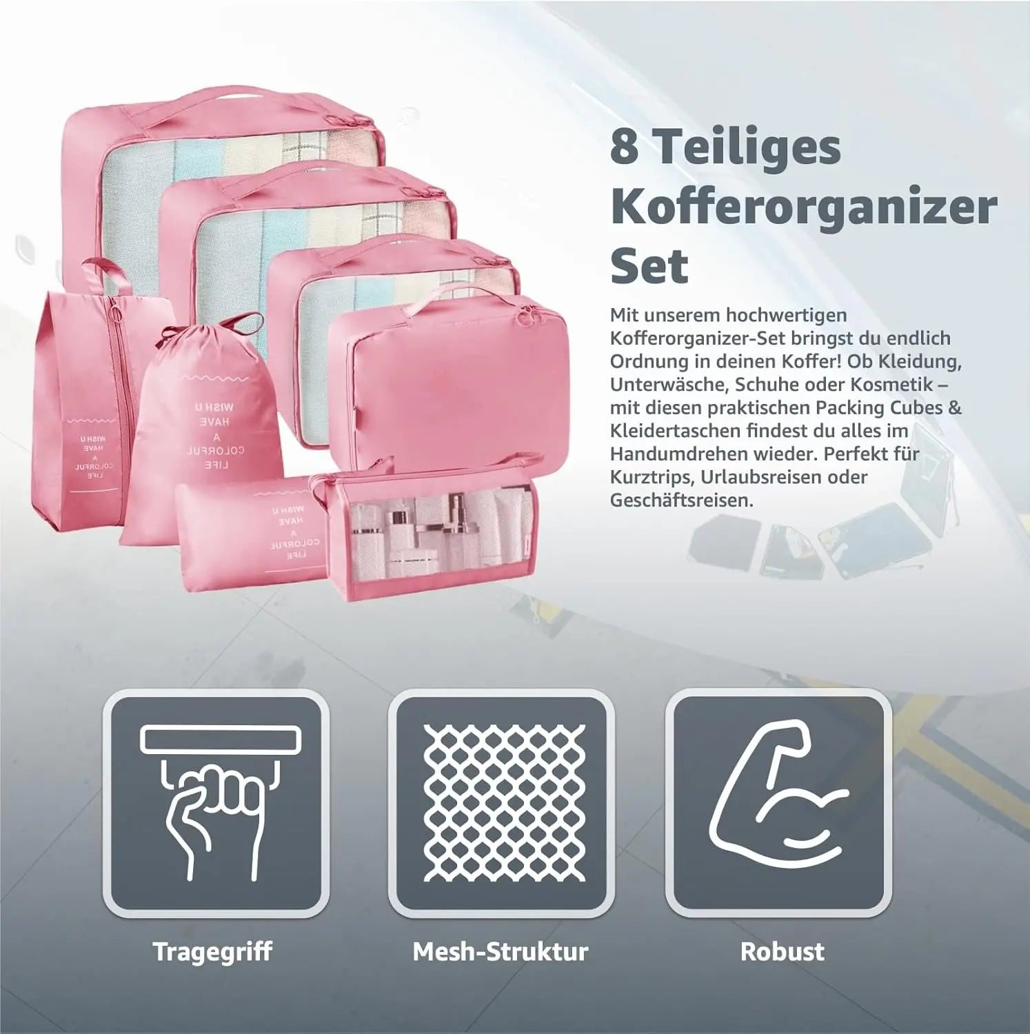 8er Set Kofferorganizer Packtaschen mit Kosmetiktasche - Packtaschen - Packing Cubes - Reiseorganizer & Kleidertaschen für Reisen - Travel Bag (Pink)