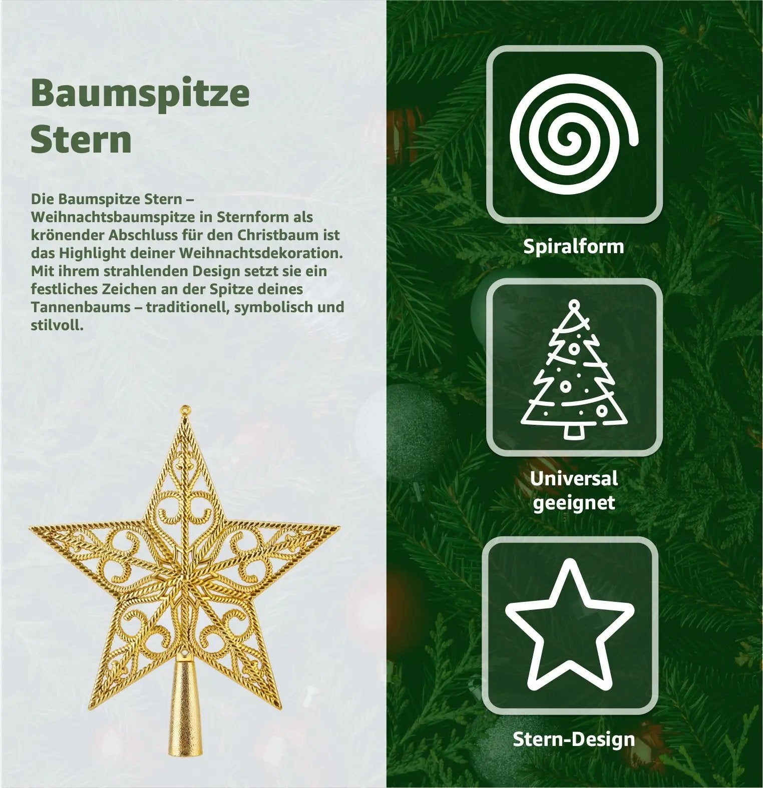 Baumspitze für Weihnachtsbaum Christbaumspitze Aufsatz für Tannenbaum Weihnachtsdekoration (Stern-Ornament-Gold)